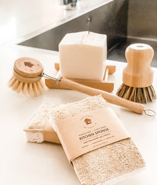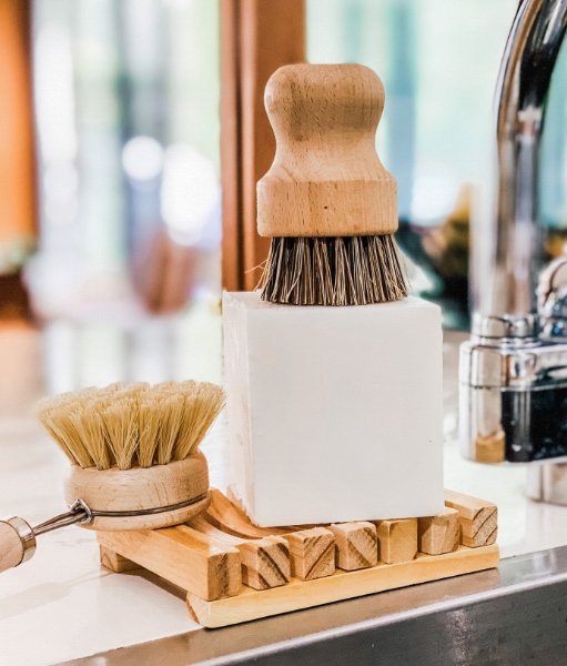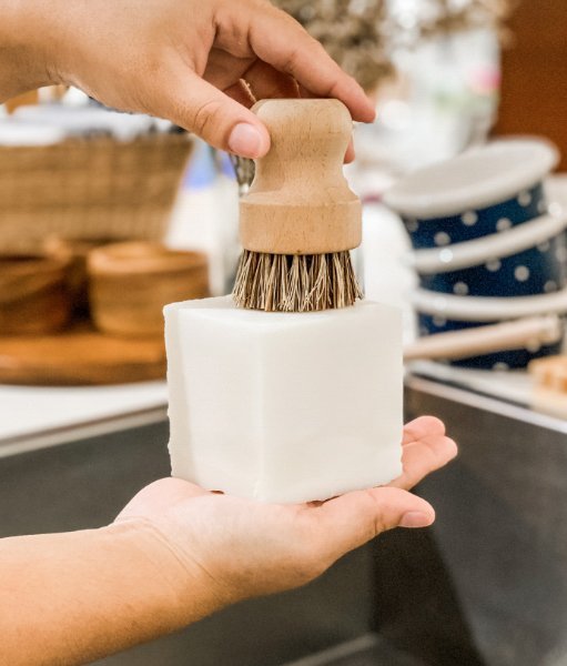 A compostable dish brush with handle and removeable head. Made from beechwood and agave fiber. Can also be used for cleaning vegetables and fruits.